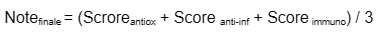 - Chaque paramètre mesuré est converti en score direct (par ex. 80% d’inhibition MDA = 80).